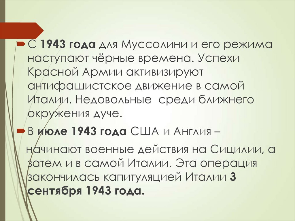 С 1943 года для Муссолини и его режиманаступают чёрные времена. Успехи