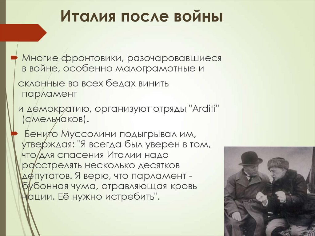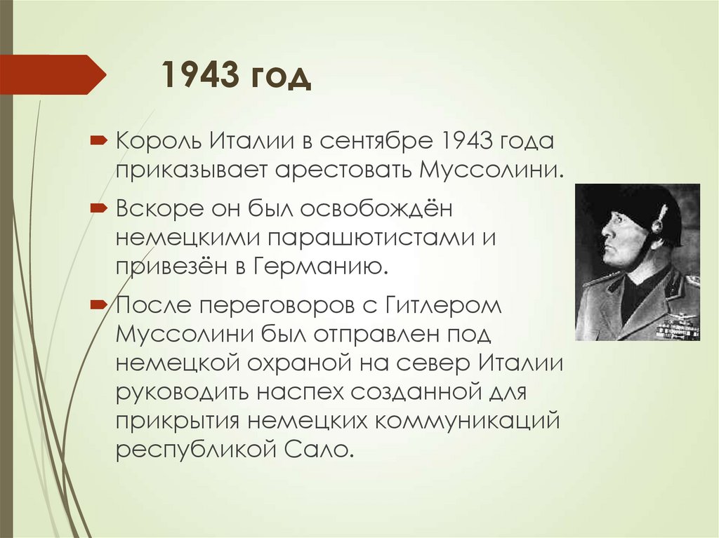 Король Италии в сентябре 1943 годаприказывает арестовать Муссолини.