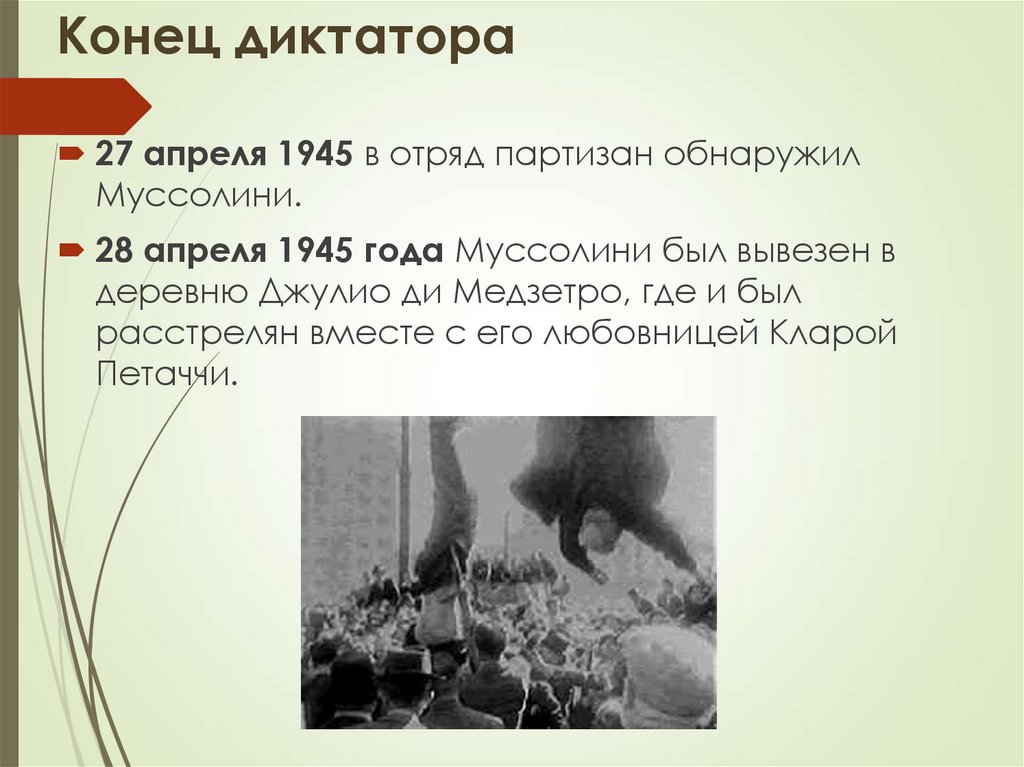 27 апреля 1945 в отряд партизан обнаружилМуссолини.