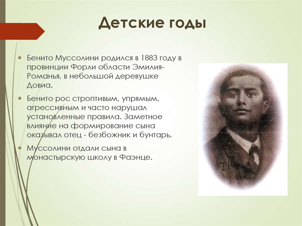 Бенито Муссолини родился в 1883 году впровинции Форли области ЭмилияРоманья, в небольшой деревушке