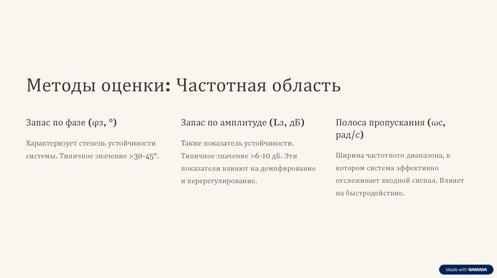 Методы оценки: Частотная областьЗапас по фазе (φз, °)