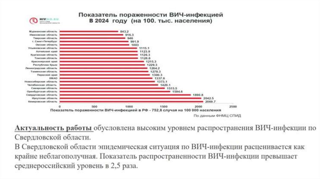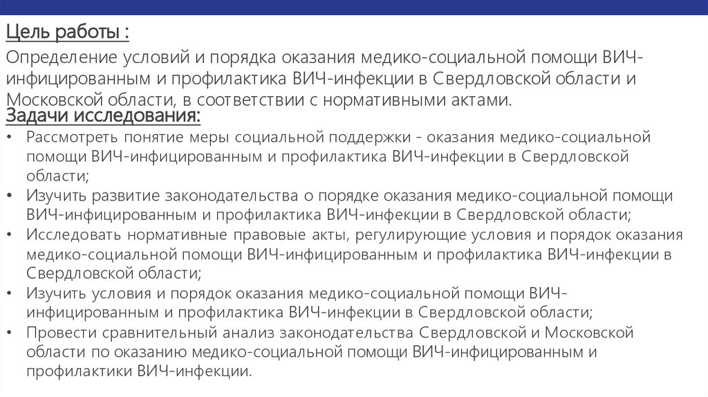 Цель работы :Определение условий и порядка оказания медико-социальной помощи ВИЧинфицированным и профилактика ВИЧ-инфекции в Свердловской области и