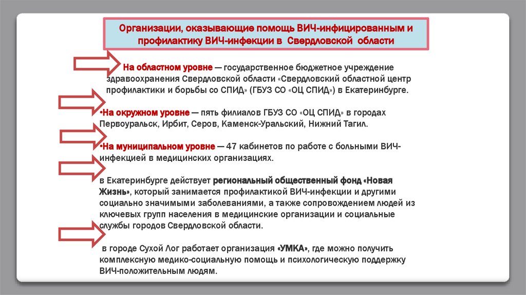 Организации, оказывающие помощь ВИЧ-инфицированным ипрофилактику ВИЧ-инфекции в Свердловской области