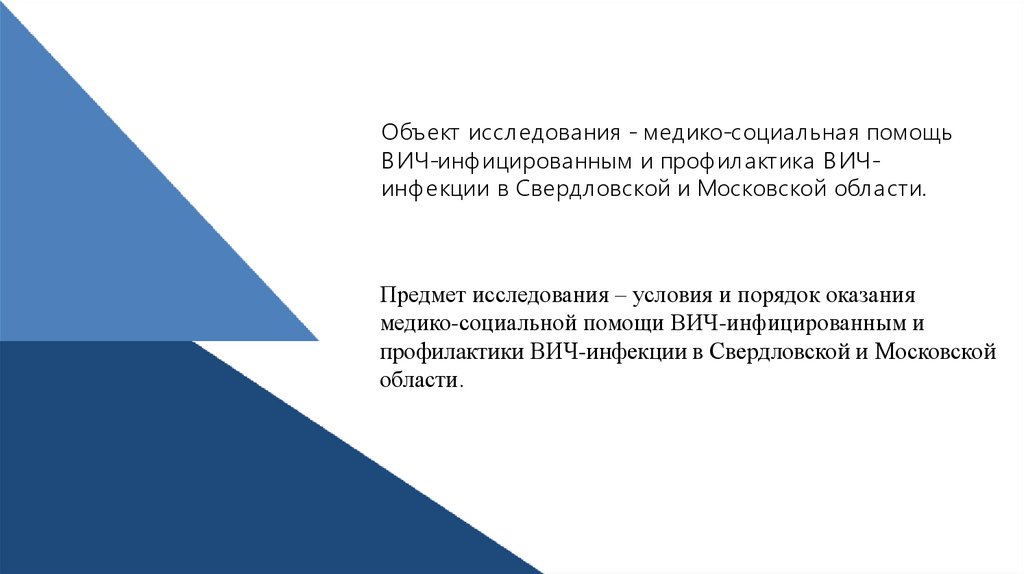 Объект исследования - медико-социальная помощьВИЧ-инфицированным и профилактика ВИЧинф екции в Свердловской и Московской области.