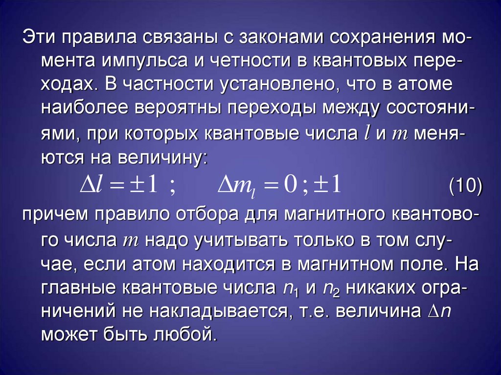 Эти правила связаны с законами сохранения момента импульса и четности в квантовых переходах. В частности установлено, что в атоменаиболее вероятны переходы между состояниями, при которых квантовые числа l и m меняются на величину: