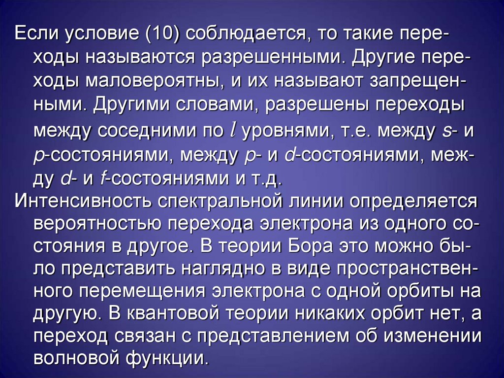 Вычисления этого элемента и приводят к сформулированным выше правилам отбора. Отметим еще раз, что правила отбора имеют вероятностный характер: "запрещенные" спектральные линии иногда можно наблюдать, но