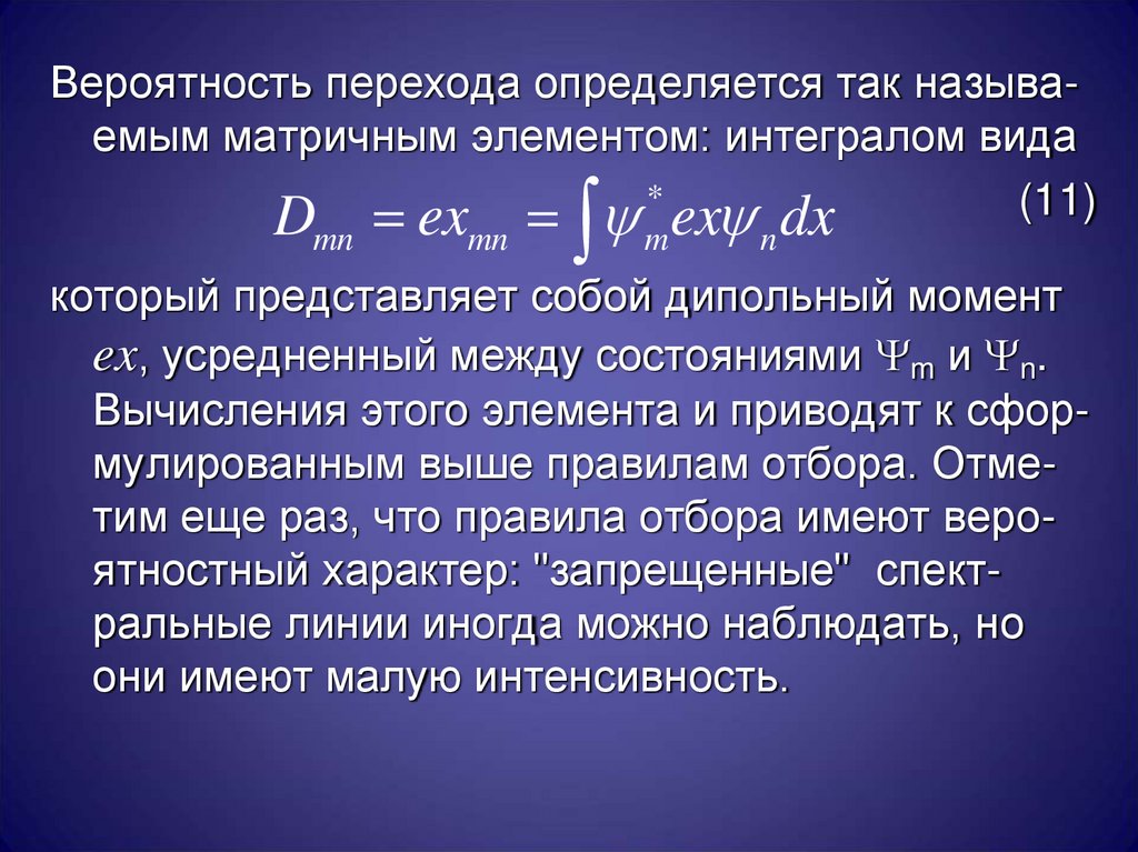 Вероятность перехода определяется так называемым матричным элементом: интегралом вида*