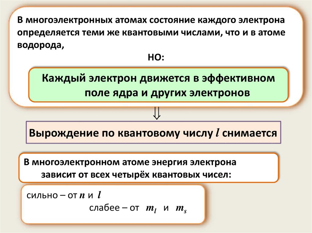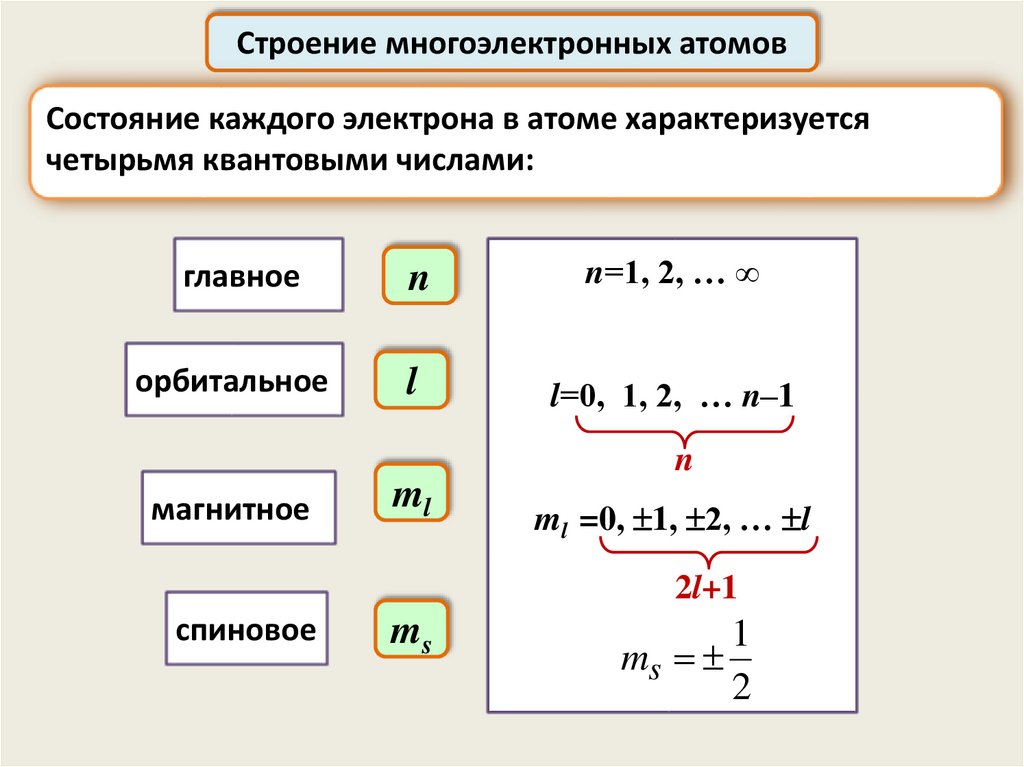 В многоэлектронных атомах состояние каждого электронаопределяется теми же квантовыми числами, что и в атоме