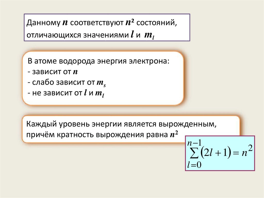 Данному n соответствуют n2 состояний,отличающихся значениями l и ml