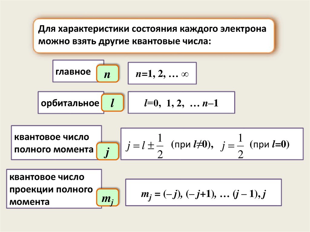 Для характеристики состояния каждого электронаможно взять другие квантовые числа:
