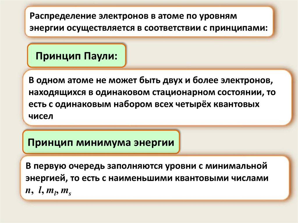 Распределение электронов в атоме по уровнямэнергии осуществляется в соответствии с принципами: