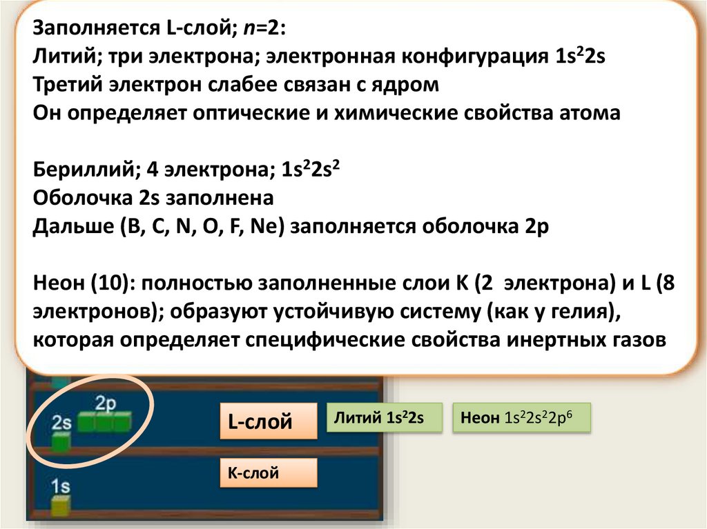 Заполняется L-слой; n=2:Литий; три электрона; электронная конфигурация 1s22s