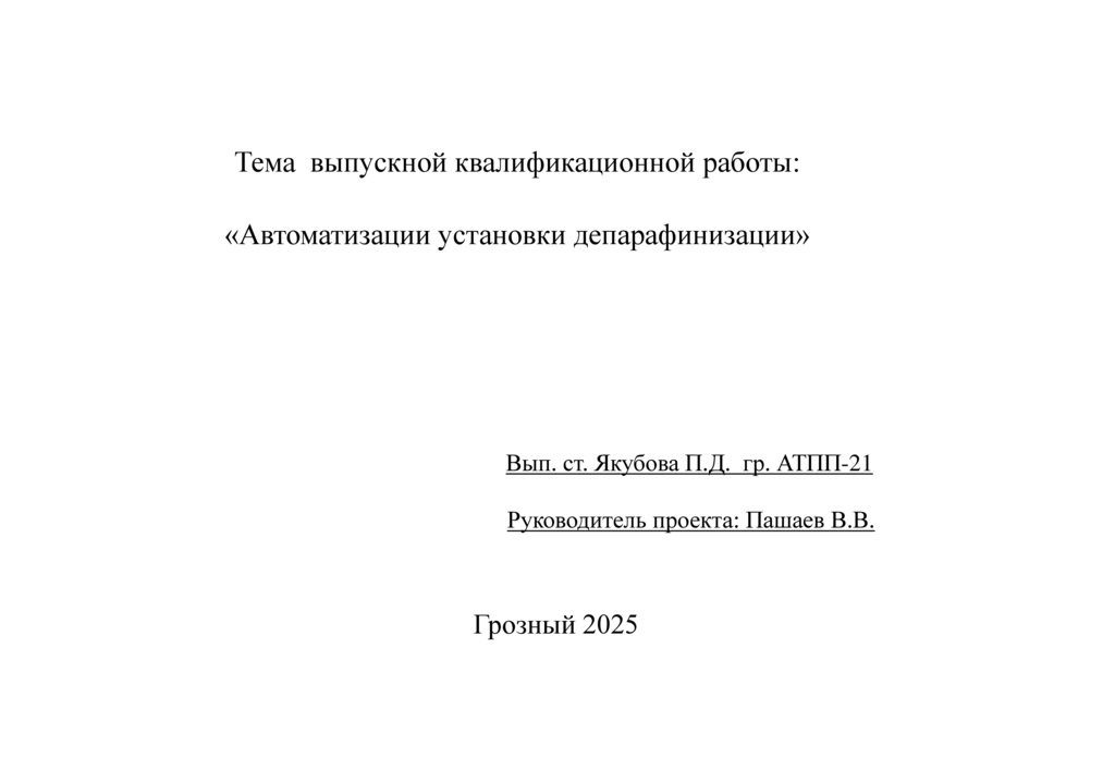 Тема выпускной квалификационной работы:«Автоматизации установки депарафинизации»