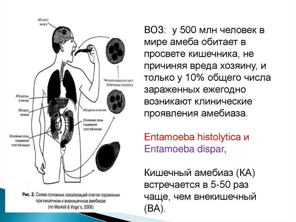 Амебами инфицированы около 10% людей в мире.Ежегодная заболеваемость кишечным амебиазом составляет