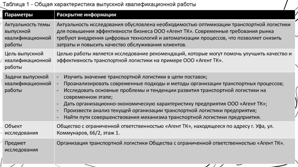 Таблица 1 - Общая характеристика выпускной квалификационной работыПараметры