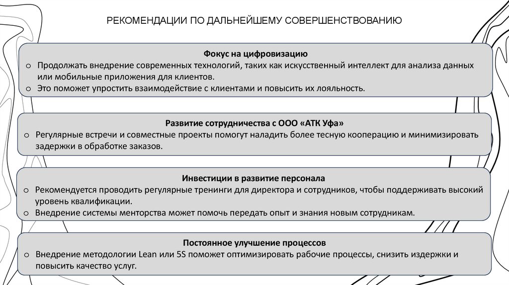 o Продолжать внедрение современных технологий, таких как искусственный интеллект для анализа данных