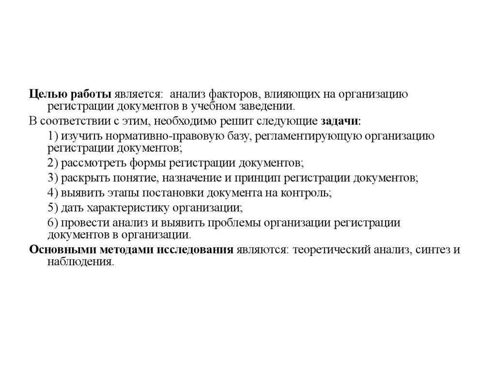 Целью работы является: анализ факторов, влияющих на организациюрегистрации документов в учебном заведении.