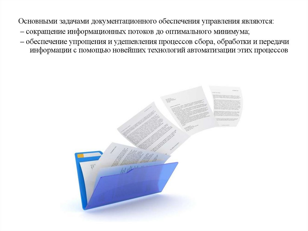Основными задачами документационного обеспечения управления являются:– сокращение информационных потоков до оптимального минимума;