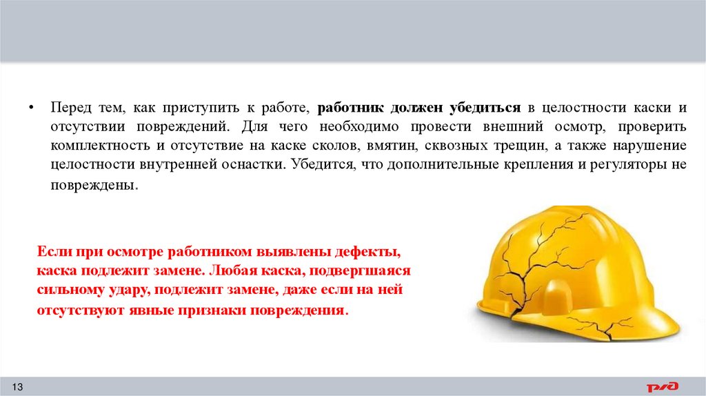 Перед тем, как приступить к работе, работник должен убедиться в целостности каски и