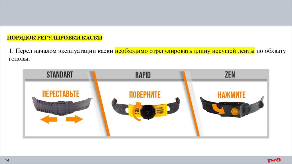 ПОРЯДОК РЕГУЛИРОВКИ КАСКИ1. Перед началом эксплуатации каски необходимо отрегулировать длину несущей ленты по обхвату