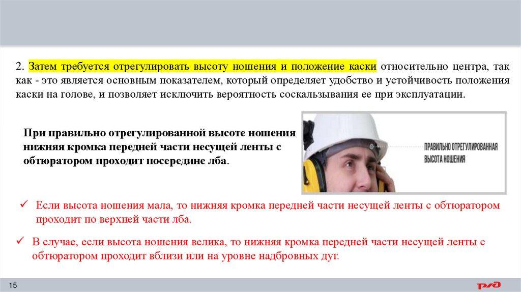 2. Затем требуется отрегулировать высоту ношения и положение каски относительно центра, таккак - это является основным показателем, который определяет удобство и устойчивость положения