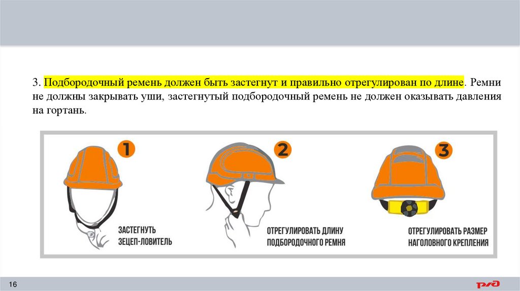 3. Подбородочный ремень должен быть застегнут и правильно отрегулирован по длине. Ремнине должны закрывать уши, застегнутый подбородочный ремень не должен оказывать давления