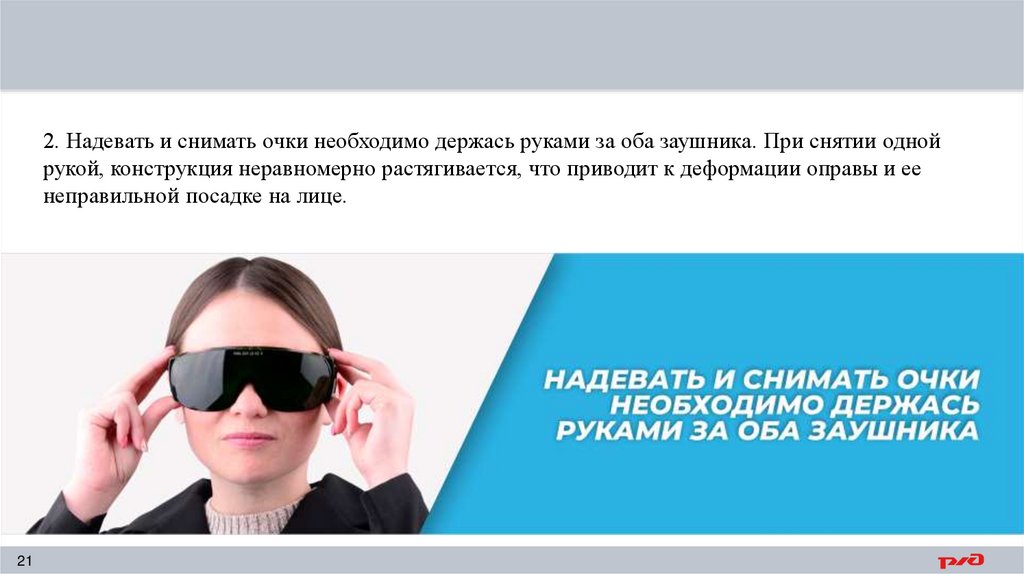 2. Надевать и снимать очки необходимо держась руками за оба заушника. При снятии однойрукой, конструкция неравномерно растягивается, что приводит к деформации оправы и ее