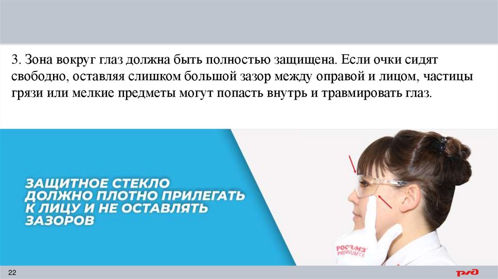 3. Зона вокруг глаз должна быть полностью защищена. Если очки сидятсвободно, оставляя слишком большой зазор между оправой и лицом, частицы