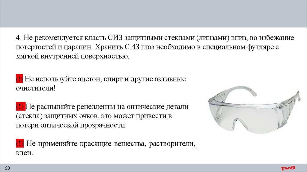 4. Не рекомендуется класть СИЗ защитными стеклами (линзами) вниз, во избежаниепотертостей и царапин. Хранить СИЗ глаз необходимо в специальном футляре с