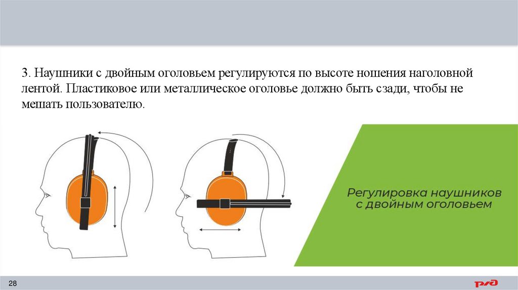3. Наушники с двойным оголовьем регулируются по высоте ношения наголовнойлентой. Пластиковое или металлическое оголовье должно быть сзади, чтобы не