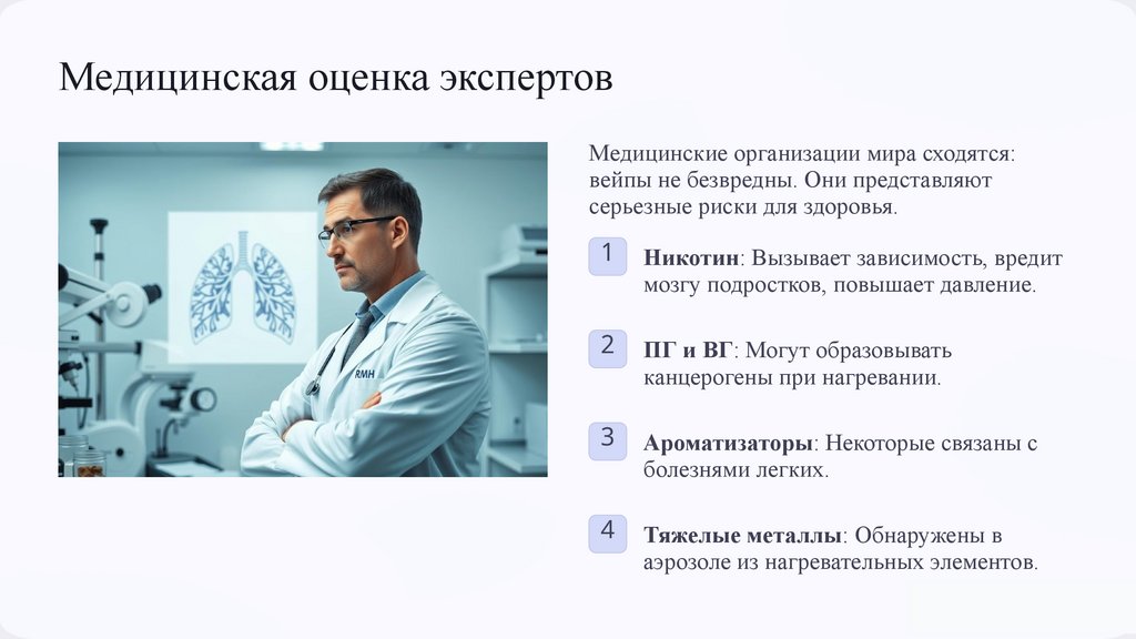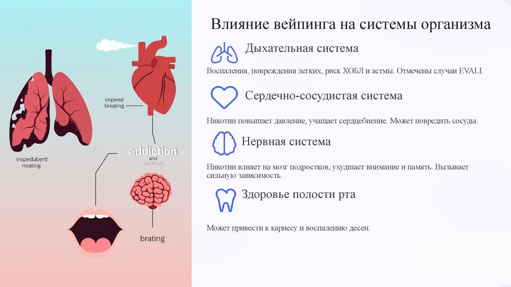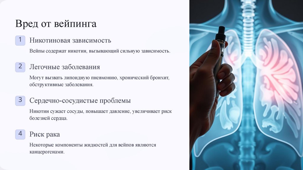 Воспаления, повреждения легких, риск ХОБЛ и астмы. Отмечены случаи EVALI.