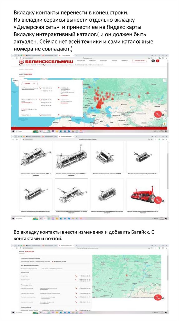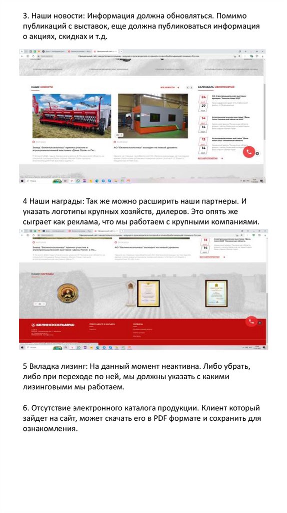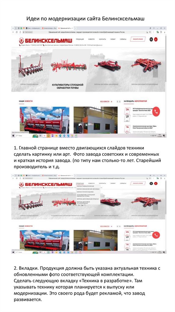 Идеи по модернизации сайта Белинсксельмаш1. Главной странице вместо двигающихся слайдов техники