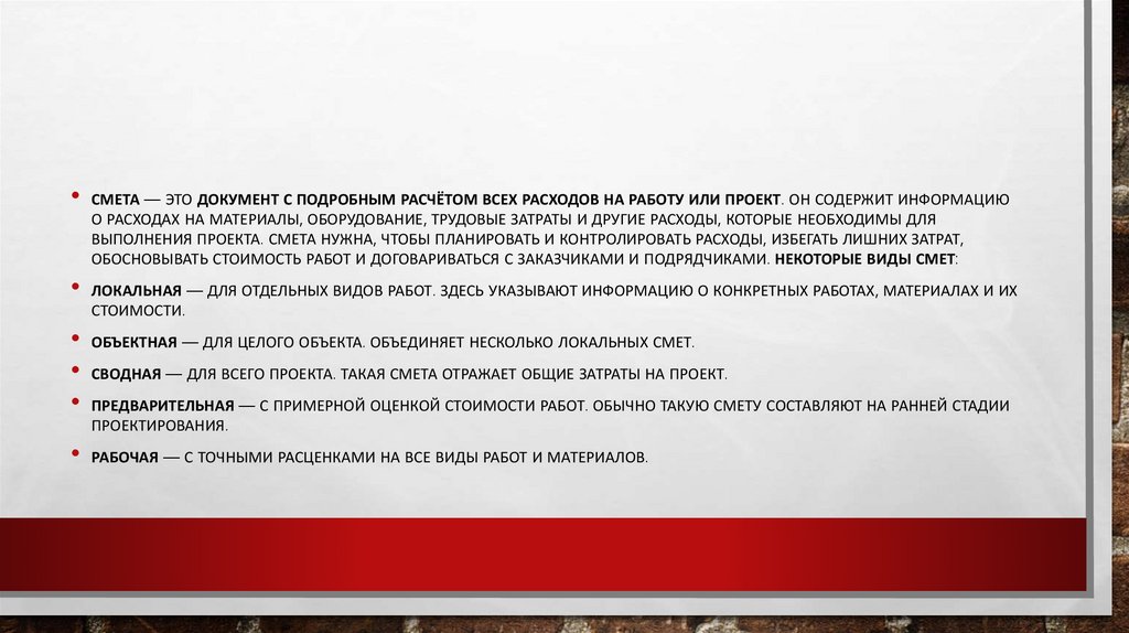 • СМЕТА — ЭТО ДОКУМЕНТ С ПОДРОБНЫМ РАСЧЁТОМ ВСЕХ РАСХОДОВ НА РАБОТУ ИЛИ ПРОЕКТ. ОН СОДЕРЖИТ ИНФОРМАЦИЮО РАСХОДАХ НА МАТЕРИАЛЫ, ОБОРУДОВАНИЕ, ТРУДОВЫЕ ЗАТРАТЫ И ДРУГИЕ РАСХОДЫ, КОТОРЫЕ НЕОБХОДИМЫ ДЛЯ