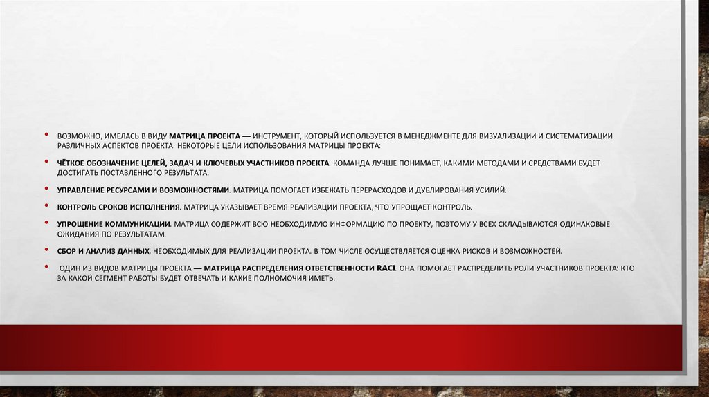 • ВОЗМОЖНО, ИМЕЛАСЬ В ВИДУ МАТРИЦА ПРОЕКТА — ИНСТРУМЕНТ, КОТОРЫЙ ИСПОЛЬЗУЕТСЯ В МЕНЕДЖМЕНТЕ ДЛЯ ВИЗУАЛИЗАЦИИ И СИСТЕМАТИЗАЦИИРАЗЛИЧНЫХ АСПЕКТОВ ПРОЕКТА. НЕКОТОРЫЕ ЦЕЛИ ИСПОЛЬЗОВАНИЯ МАТРИЦЫ ПРОЕКТА: