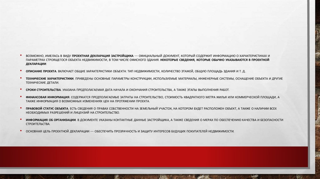 ВОЗМОЖНО, ИМЕЛАСЬ В ВИДУ ПРОЕКТНАЯ ДЕКЛАРАЦИЯ ЗАСТРОЙЩИКА — ОФИЦИАЛЬНЫЙ ДОКУМЕНТ, КОТОРЫЙ СОДЕРЖИТ ИНФОРМАЦИЮ О ХАРАКТЕРИСТИКАХ И