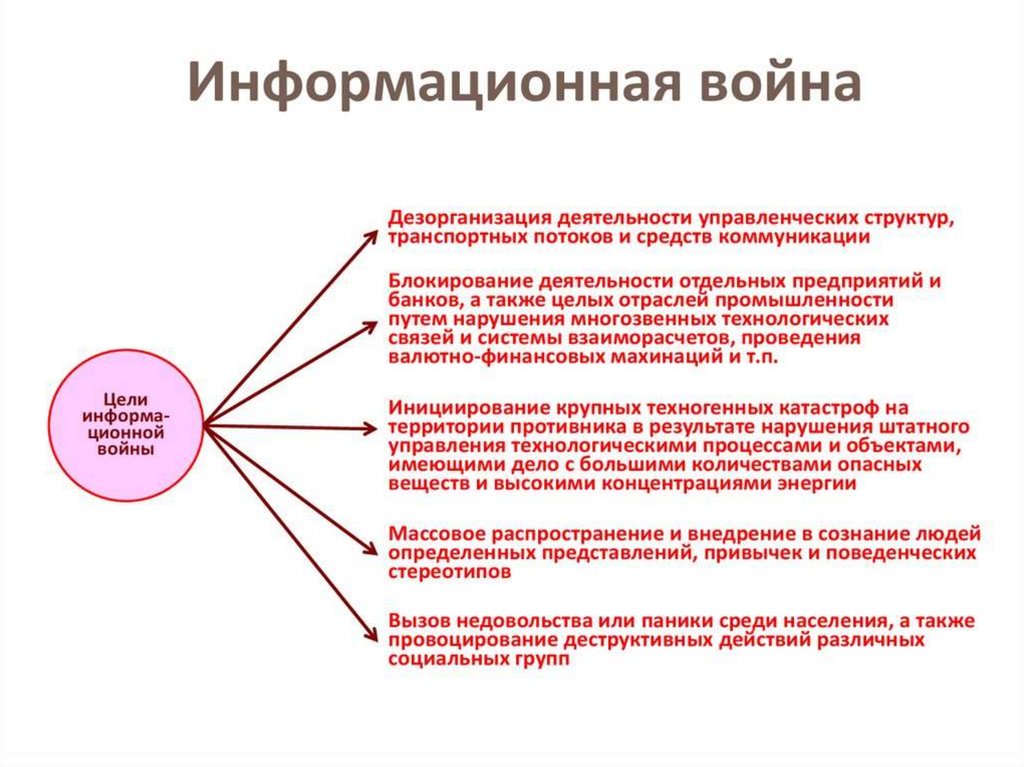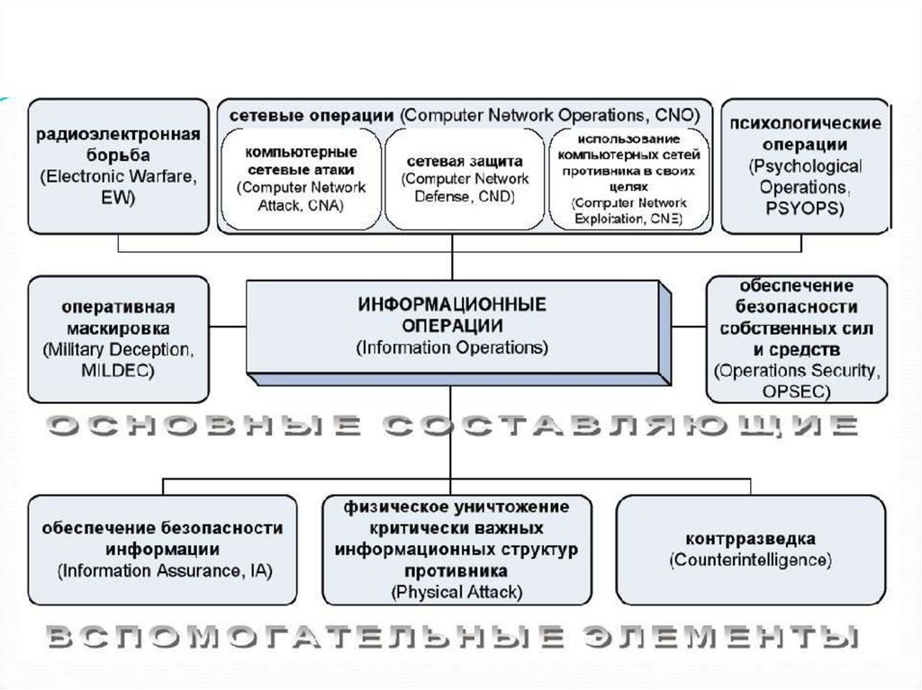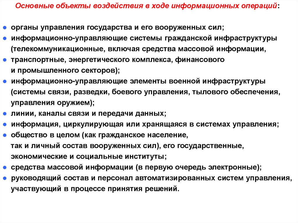 Основные объекты воздействия в ходе информационных операций:органы управления государства и его вооруженных сил;