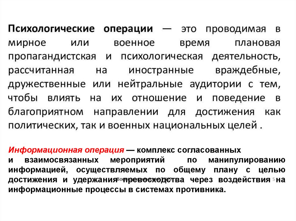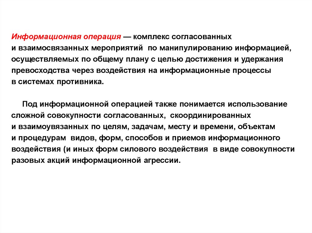 Информационная операция — комплекс согласованныхи взаимосвязанных мероприятий по манипулированию информацией,