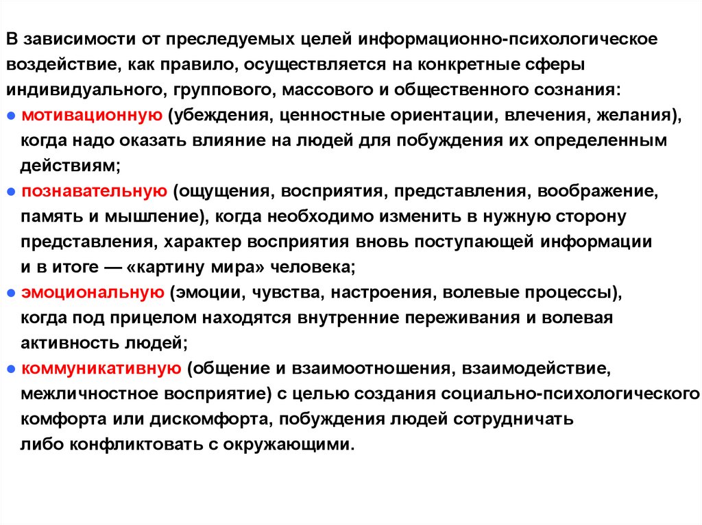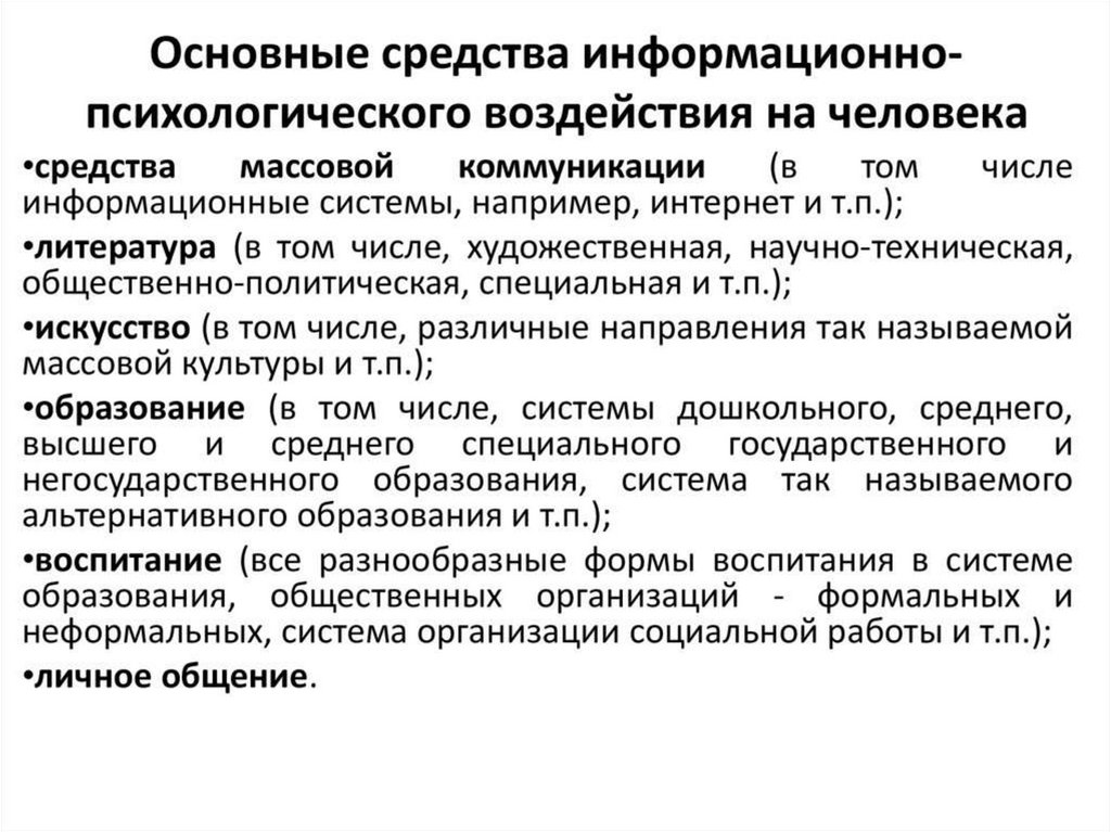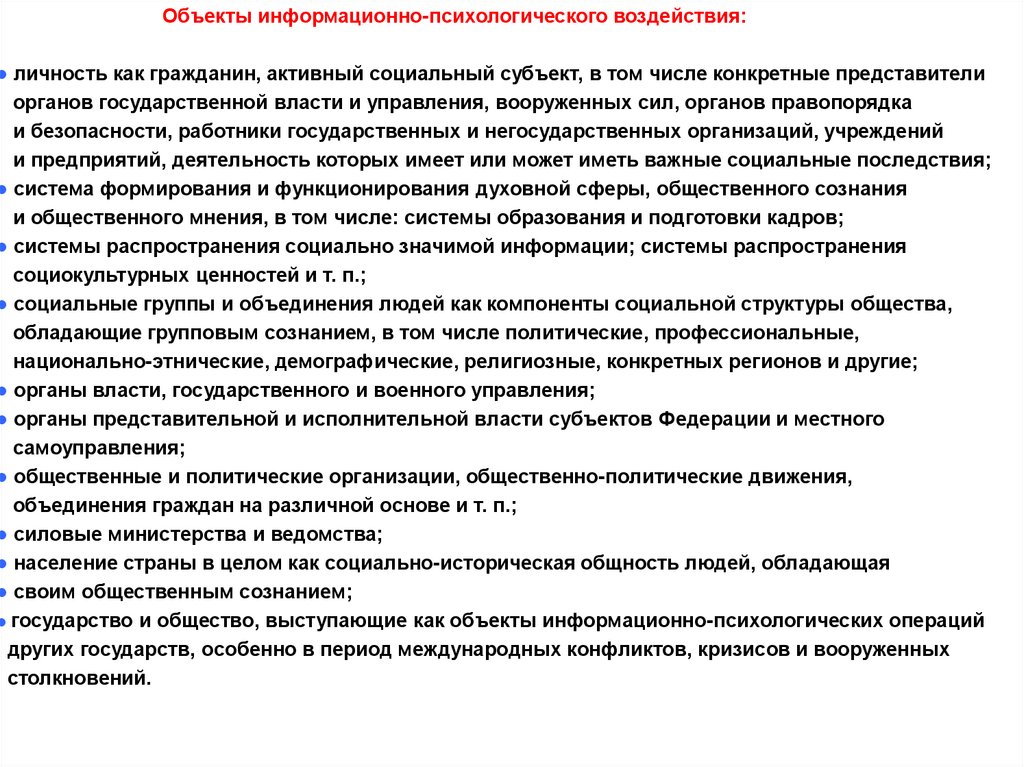Объекты информационно-психологического воздействия:личность как гражданин, активный социальный субъект, в том числе конкретные представители