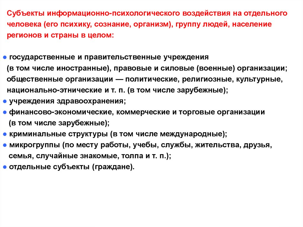 Субъекты информационно-психологического воздействия на отдельногочеловека (его психику, сознание, организм), группу людей, население