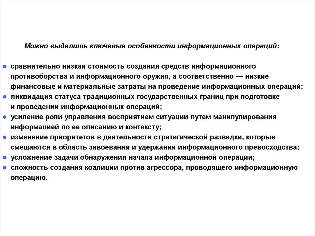 Можно выделить ключевые особенности информационных операций:сравнительно низкая стоимость создания средств информационного