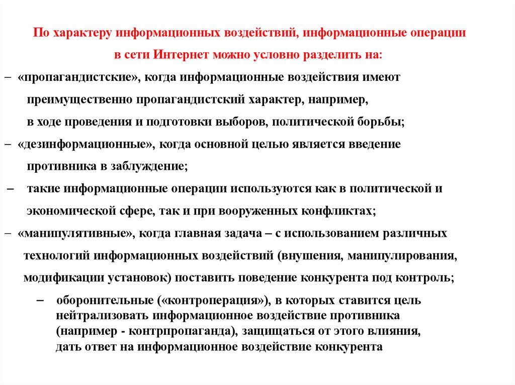 По характеру информационных воздействий, информационные операциив сети Интернет можно условно разделить на:
