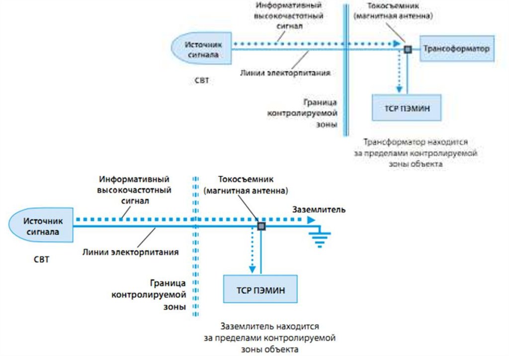 г) наводки информативных сигналов в цепях заземления ТСОИ, вызванные информативными ПЭМИ