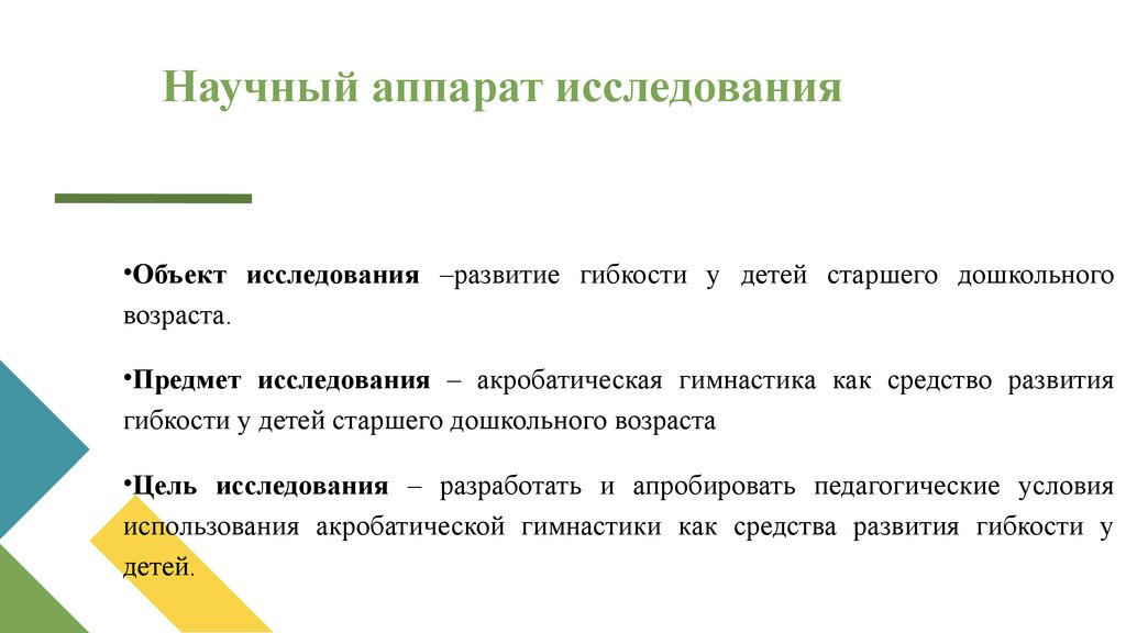 Научный аппарат исследования•Объект исследования –развитие гибкости у детей старшего дошкольного