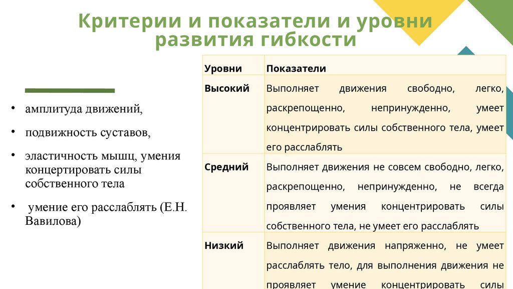 Критерии и показатели и уровниразвития гибкости