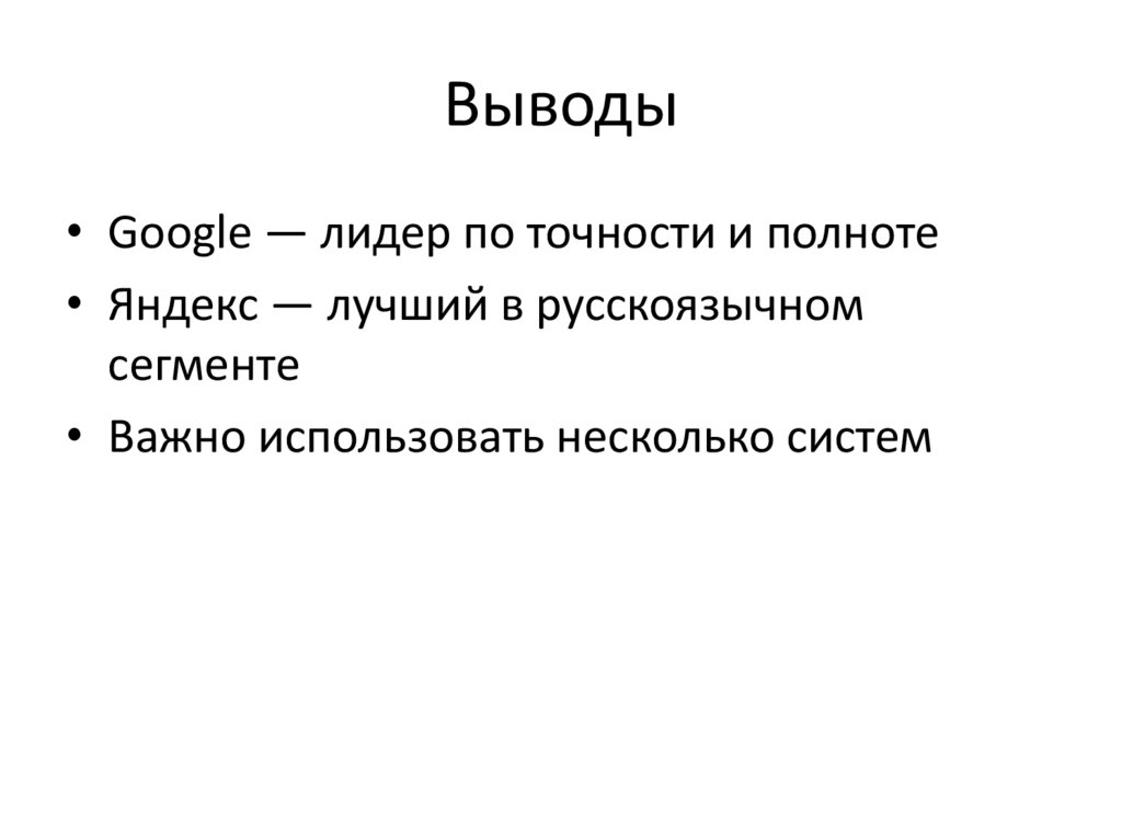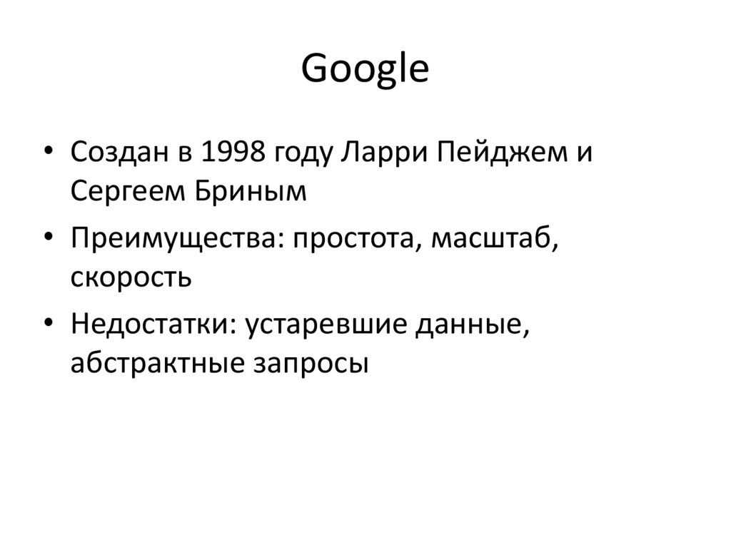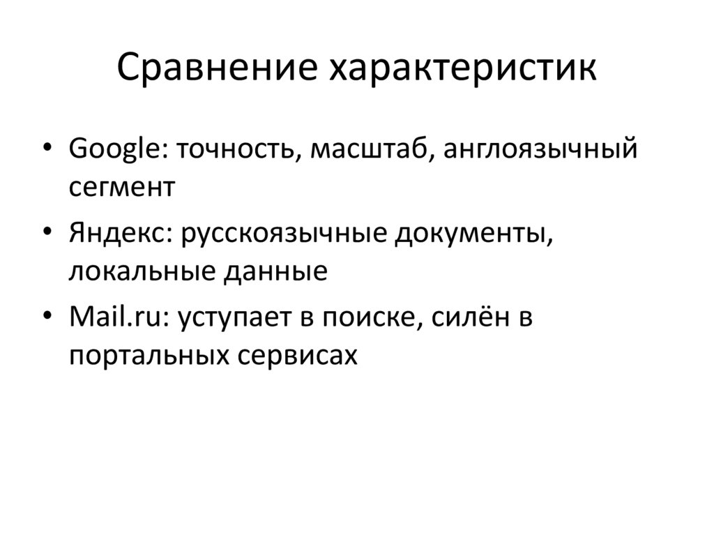 Сравнение характеристик• Google: точность, масштаб, англоязычный