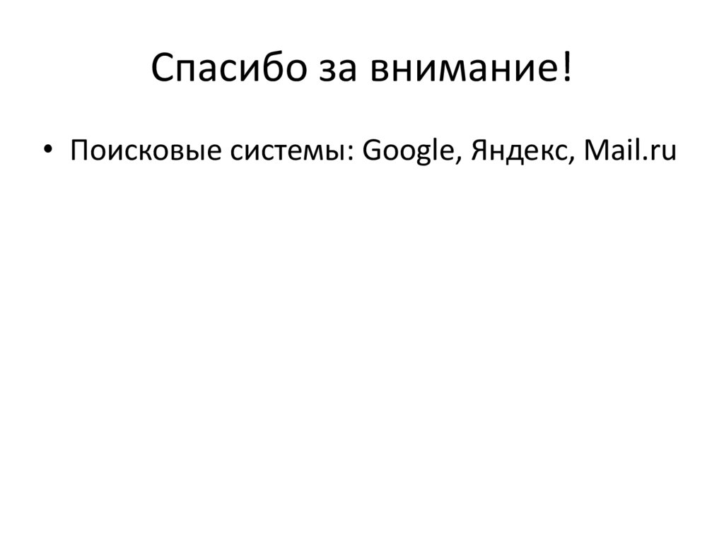 Спасибо за внимание!• Поисковые системы: Google, Яндекс, Mail.ru