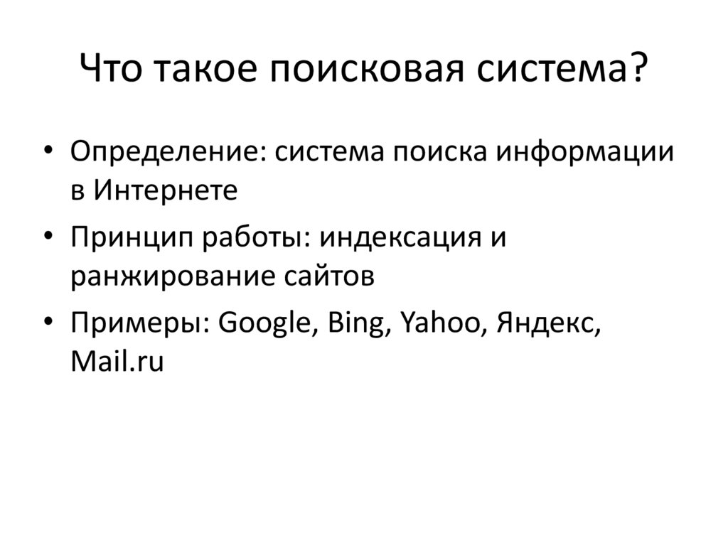 • Примеры: Google, Bing, Yahoo, Яндекс,