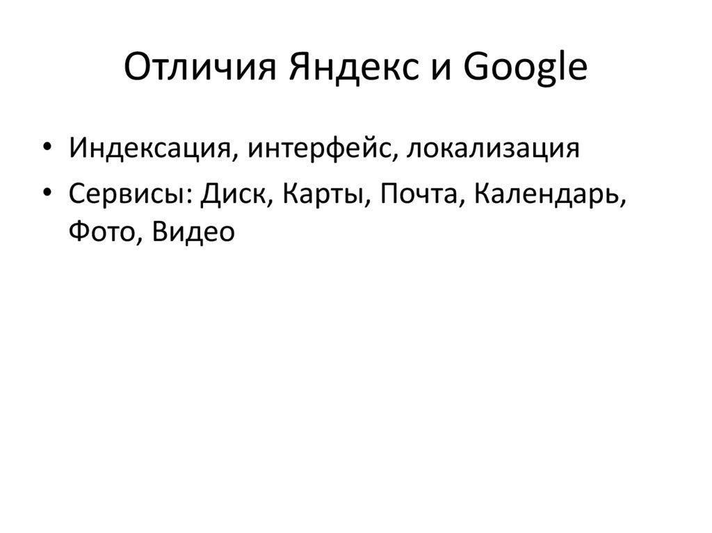 Отличия Яндекс и Google• Индексация, интерфейс, локализация