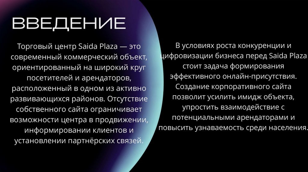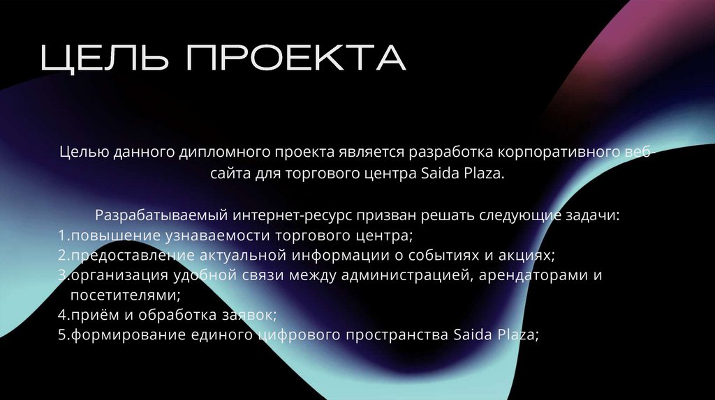 Целью данного дипломного проекта является разработка корпоративного вебсайта для торгового центра Saida Plaza.Разрабатываемый интернет-ресурс призван решать следующие задачи: