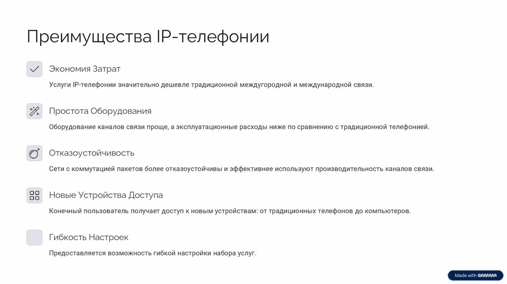 Оборудование каналов связи проще, а эксплуатационные расходы ниже по сравнению с традиционной телефонией.